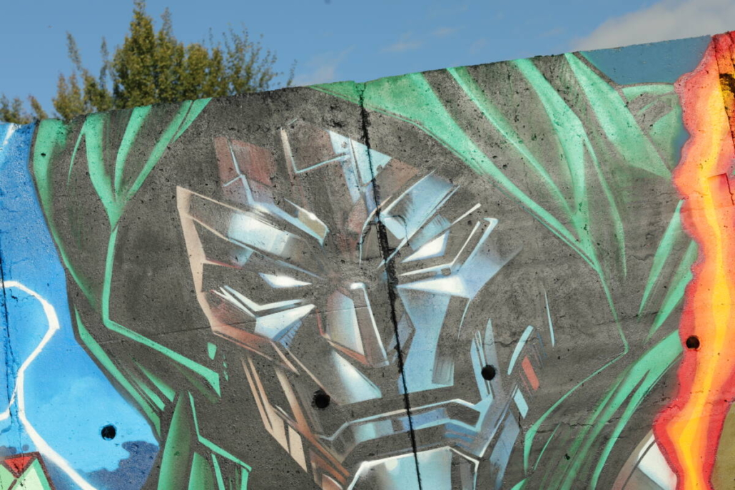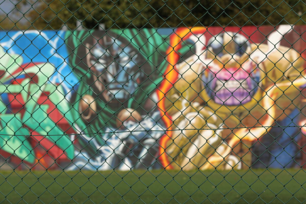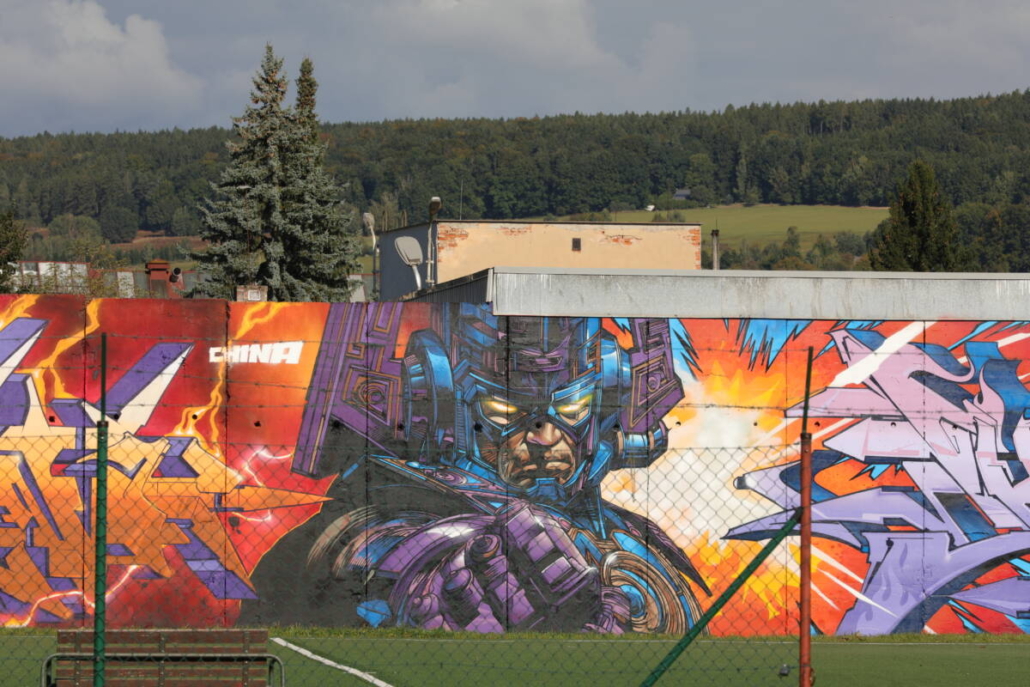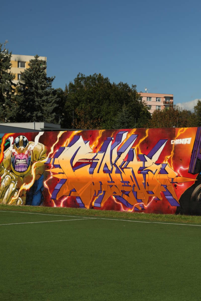Tato stěna, která je směrem k hřišti místní průmyslovky a je v jejím areálu, obdržela unikátní refit a je skvělým kontrastem k venkovnímu murálu. Graffiti jména v kombinaci s charaktery superhrdinů ve světovém provedení tak ukazuje, jak na obyčejné betonové stěně může vzniknout něco, co nikdo nečekal.