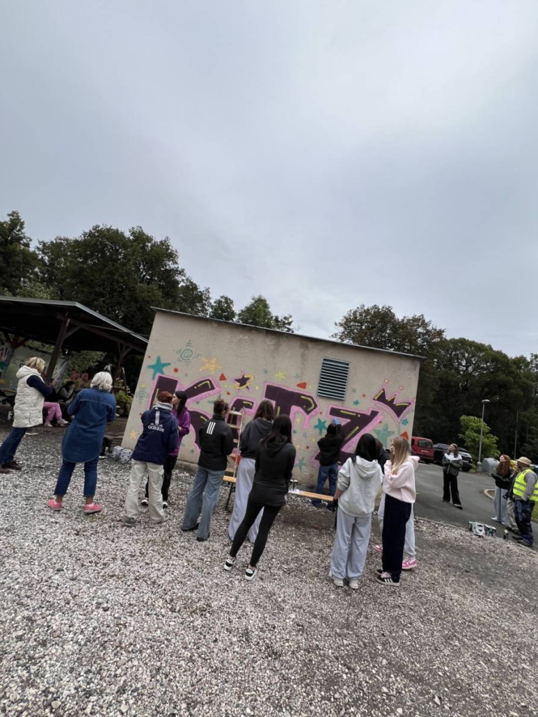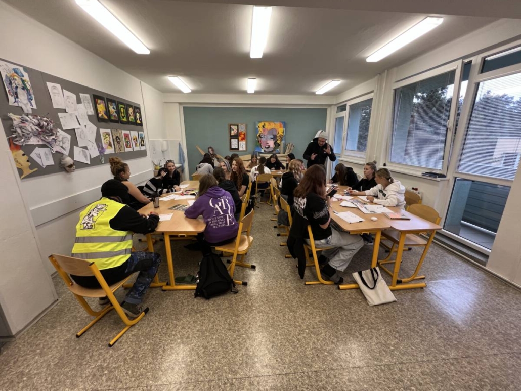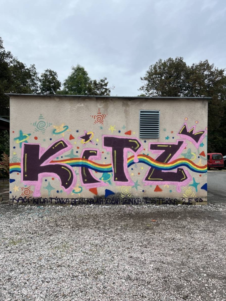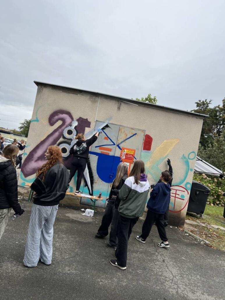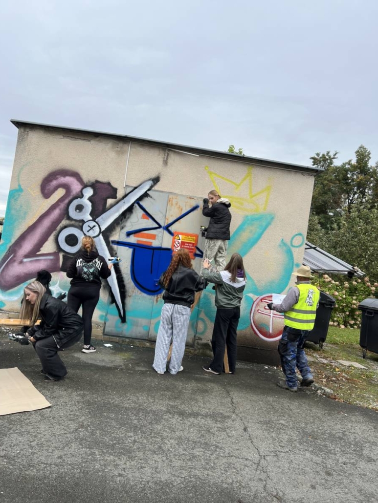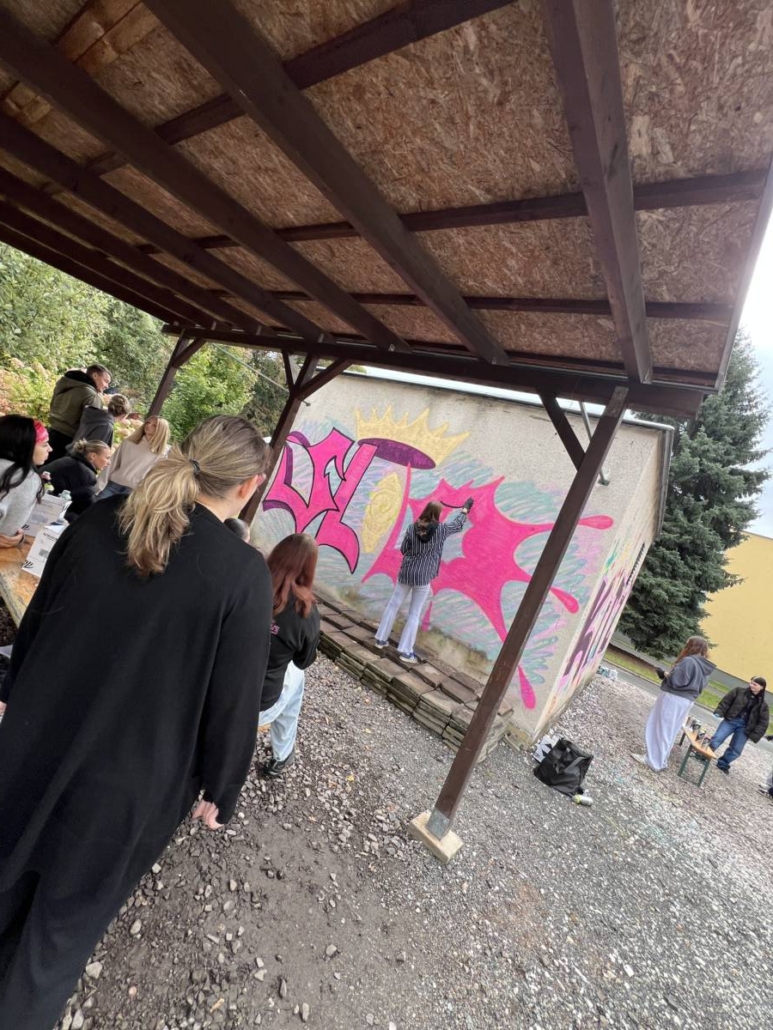 Poté následovala praktická ukázka formou workshopu, kdy učitelé vybrali vhodné žáky, v tomto případě žákyně, a ty se účastnili několikahodinového workshopu zakončeného aplikací barvy ve spreji na přilehlou trafostanici v objektu školy.