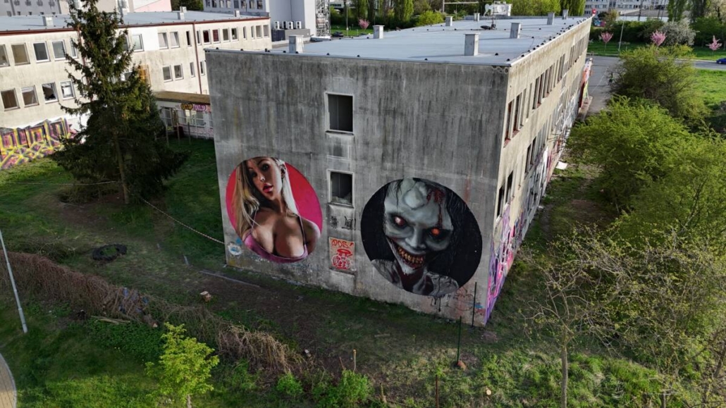 Druhé průčelí jenž u pár lidí vyvolalo různé reakce, vytvořili umělci JW Mindstrike a Sweap, kteří stěnu pojali výjevem vyzývavé ženy a strašidla.